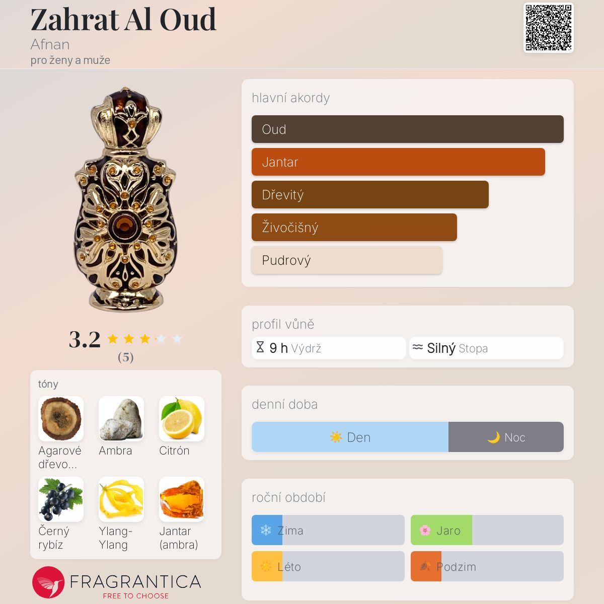 Zahrat Al Oud podle Afnan je Orientální Woody vůně pro ženy a muže. Zahrat Al Oud byl/a uveden/a v roce 2019. Vrchní tóny jsou Citrón a Černý rybíz; střední tóny jsouYlang-Ylang, Jantar (ambra) a Mastek ; základní tóny jsou Agarové dřevo (oud), Ambra, Santalové dřevo, Cedr, Fazole tonka a Mech.