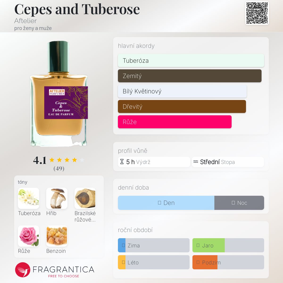 Cepes and Tuberose podle Aftelier je Floral Woody Musk vůně pro ženy a muže. "Nosem" za touto vůní je Mandy Aftel. Vrchní tón je Brazilské růžové dřevo ; střední tóny jsouTuberóza a Růže ; základní tóny jsou Hřib smrkový a Benzoin.