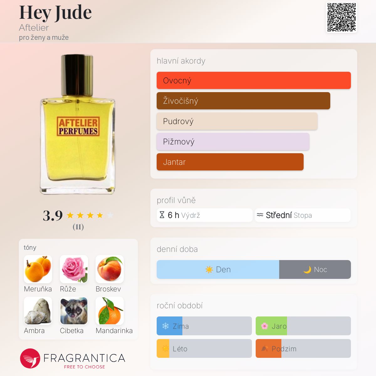 Hey Jude podle Aftelier je Floral Fruity vůně pro ženy a muže. Hey Jude byl/a uveden/a v roce 2023. "Nosem" za touto vůní je Mandy Aftel. Vrchní tóny jsou Žlutá mandarinka a Bergamot; střední tóny jsouMeruňka, Turecká růže a Broskev ; základní tóny jsou Ambra, Cibetka a Přírodní pižmo.