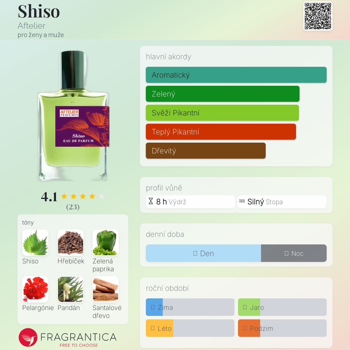 Shiso podle Aftelier je Aromatic Green vůně pro ženy a muže. "Nosem" za touto vůní je Mandy Aftel. Vrchní tóny jsou Hřebíček a Zelená paprika; střední tóny jsouShiso, Pelargónie a Pandán ; základní tóny jsou Santalové dřevo, Agarové dřevo (oud) a Pačuli.