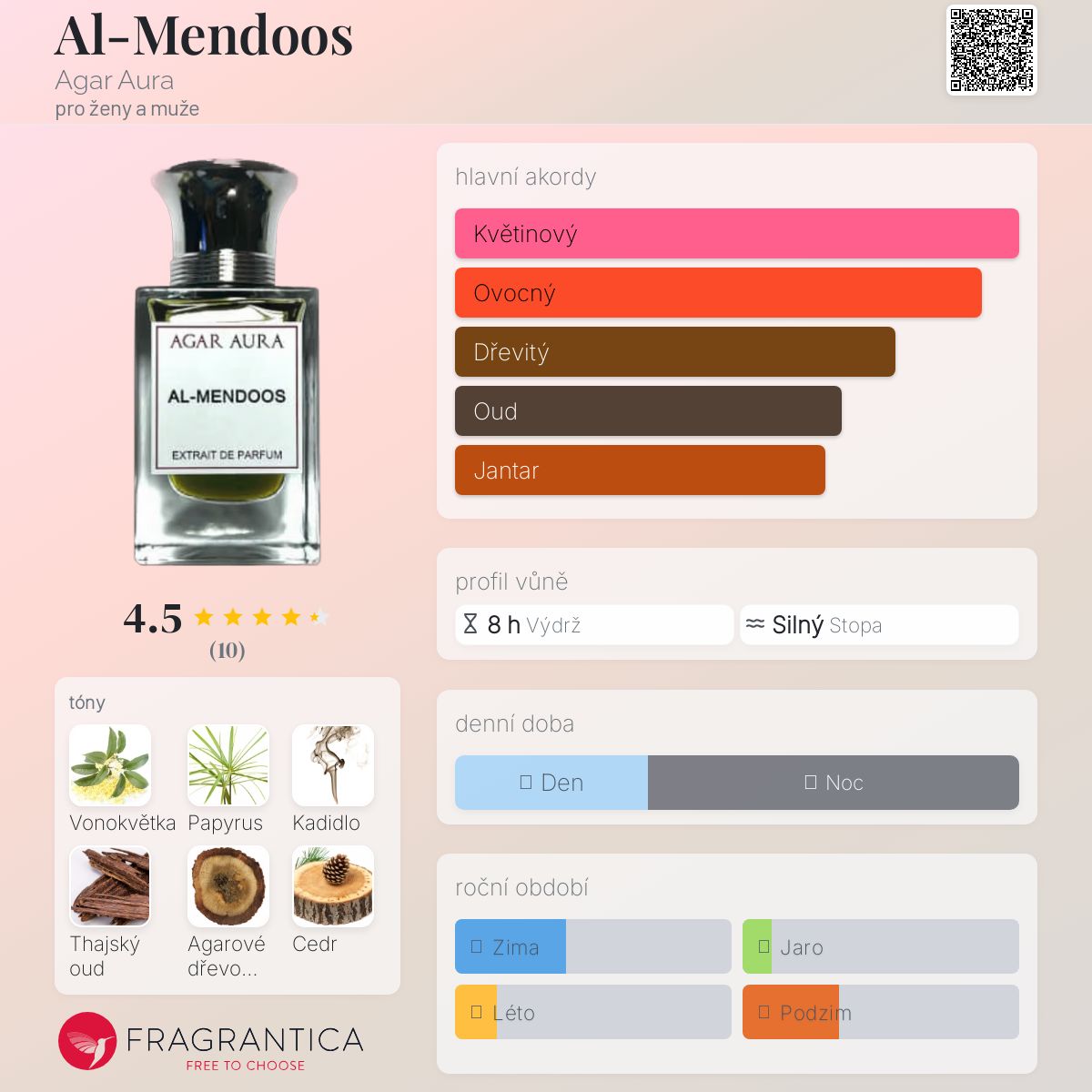 Al-Mendoos podle Agar Aura je vůně pro ženy a muže. Toto je nová vůně. Al-Mendoos byl/a uveden/a v roce 2024. "Nosem" za touto vůní je Taha Syed.
