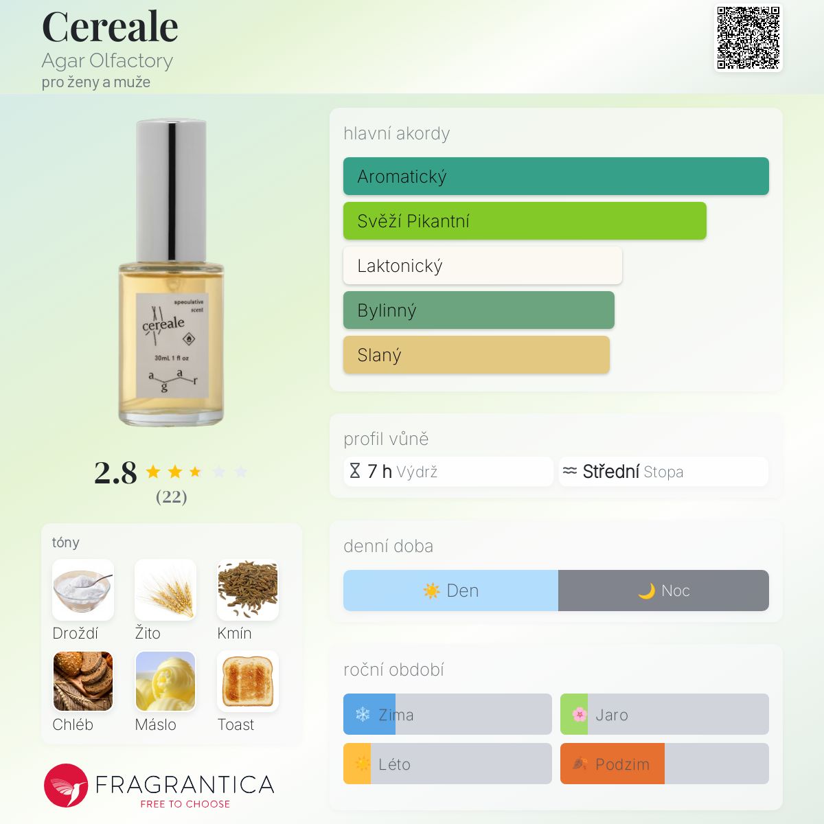 Cereale podle Agar Olfactory je vůně pro ženy a muže. Toto je nová vůně. Cereale byl/a uveden/a v roce 2024. Cereale byl/a vytvořen/a Agustine Zegers a Isabel Lee. Vrchní tón je Kmín ; střední tóny jsouŽito a Máslo ; základní tóny jsou Droždí, Chléb a Toust.