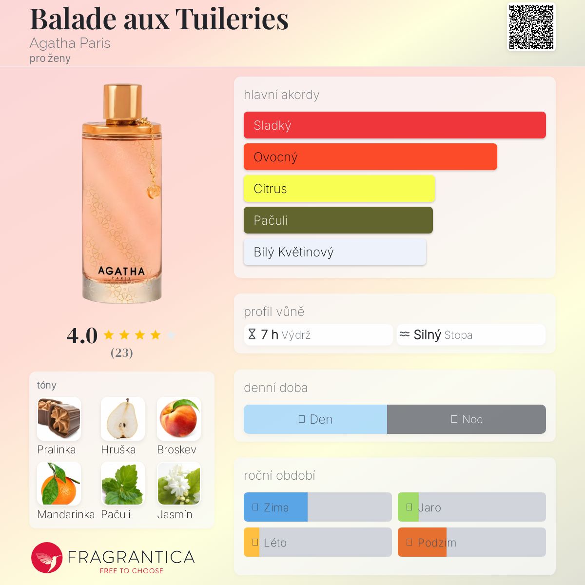 Balade aux Tuileries podle Agatha Paris je Orientální Floral vůně pro ženy. Balade aux Tuileries byl/a uveden/a v roce 2017. "Nosem" za touto vůní je Jérôme di Marino. Vrchní tóny jsou Hruška, Mandarinka a Frézie; střední tóny jsouBroskev, Jasmín a Růže ; základní tóny jsou Pralinka, Pačuli a Vanilka.