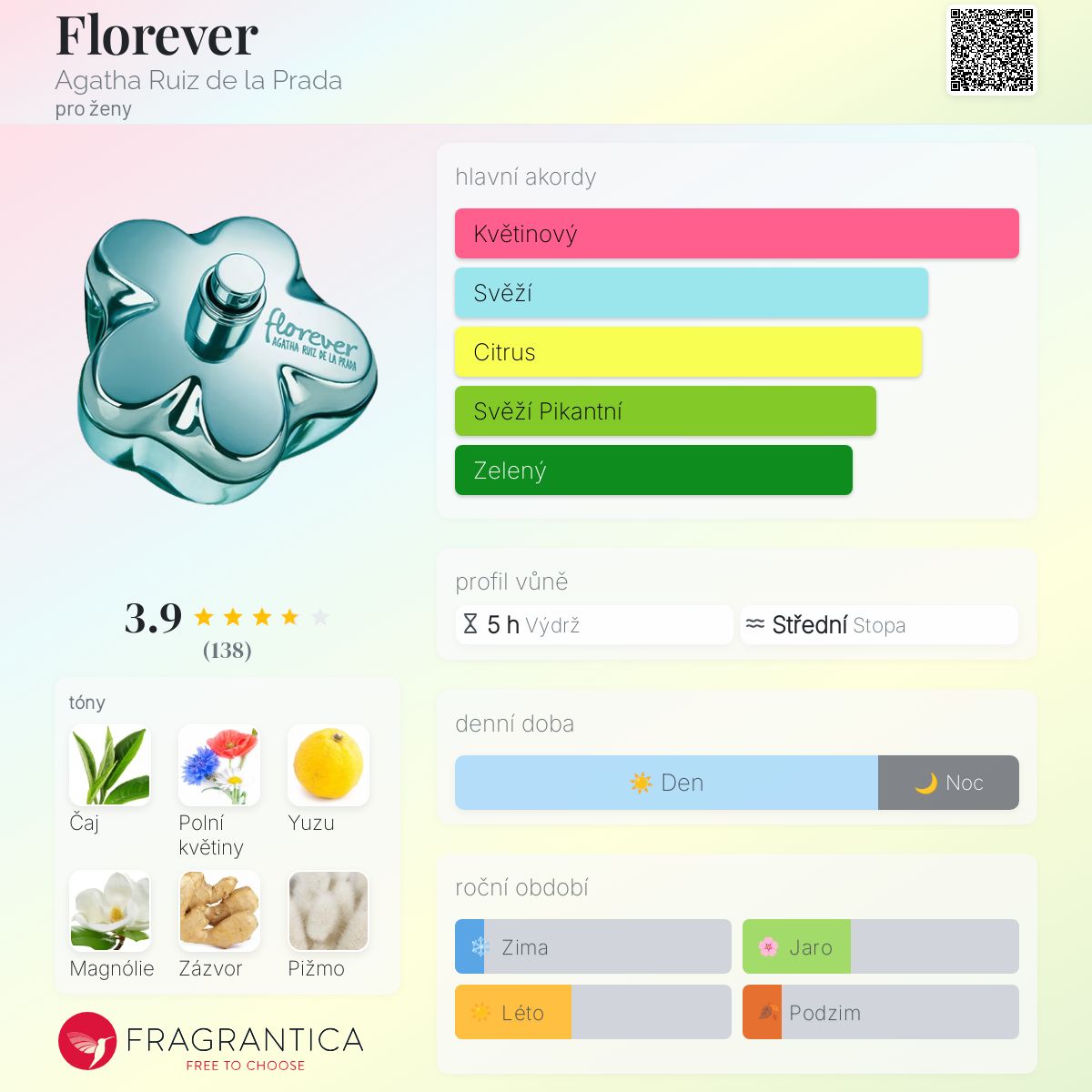 Florever podle Agatha Ruiz de la Prada je Floral vůně pro ženy. Florever byl/a uveden/a v roce 2015. Vrchní tóny jsou Čaj a Yuzu; střední tóny jsouPolní květiny, Magnólie, Zázvor a Růžový pepř ; základní tóny jsou Pižmo, Dřevo cypřišku tupolistého, Cedr a Jantar (ambra).
