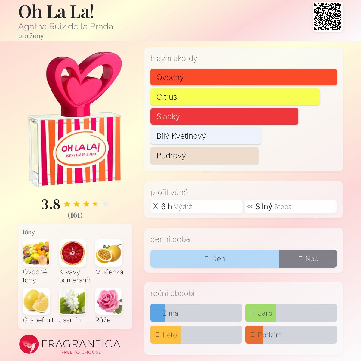 Oh La La! podle Agatha Ruiz de la Prada je Floral Fruity vůně pro ženy. Oh La La! byl/a uveden/a v roce 2009. "Nosem" za touto vůní je Puig. Vrchní tóny jsou Ovocné tóny, Krvavý pomeranč a Grapefruit; střední tóny jsouMučenka, Jasmín a Tinktura z růže ; základní tóny jsou Vanilka, Pižmo, Santalové dřevo a Virginský cedr.
