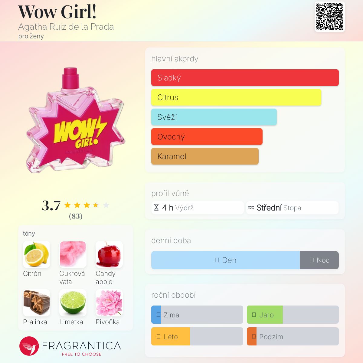 Wow Girl! podle Agatha Ruiz de la Prada je Floral Fruity Gourmand vůně pro ženy. Wow Girl! byl/a uveden/a v roce 2019. "Nosem" za touto vůní je Olivier Cresp. Vrchní tóny jsou Citrón, Sladké jablko a Limetka; střední tóny jsouPivoňka a Durman ; základní tóny jsou Cukrová vata, Pralinka, Mech a Bílé dřevo.