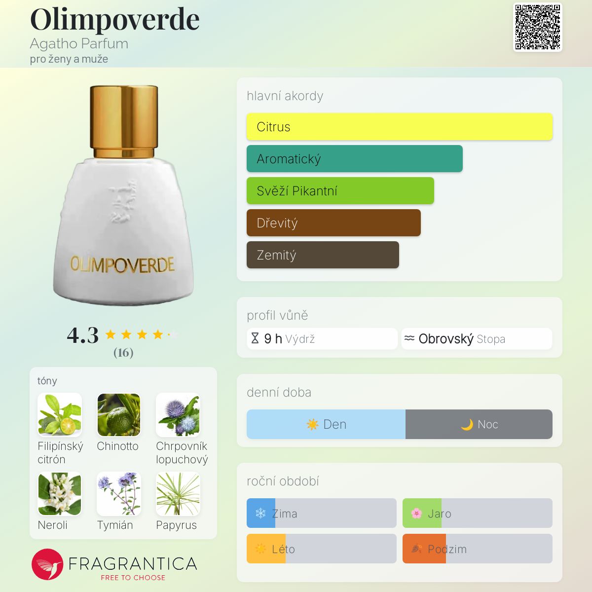 Olimpoverde podle Agatho Parfum je Orientální Woody vůně pro ženy a muže. Toto je nová vůně. Olimpoverde byl/a uveden/a v roce 2024. Vrchní tóny jsou Filipínský citrón, Neroli a Sladký pomeranč; střední tóny jsouChinotto, Červený tymián a Papyrus ; základní tóny jsou Chrpovník lopuchový, Bílé pižmo, Agarové dřevo (oud) a Fazole tonka.