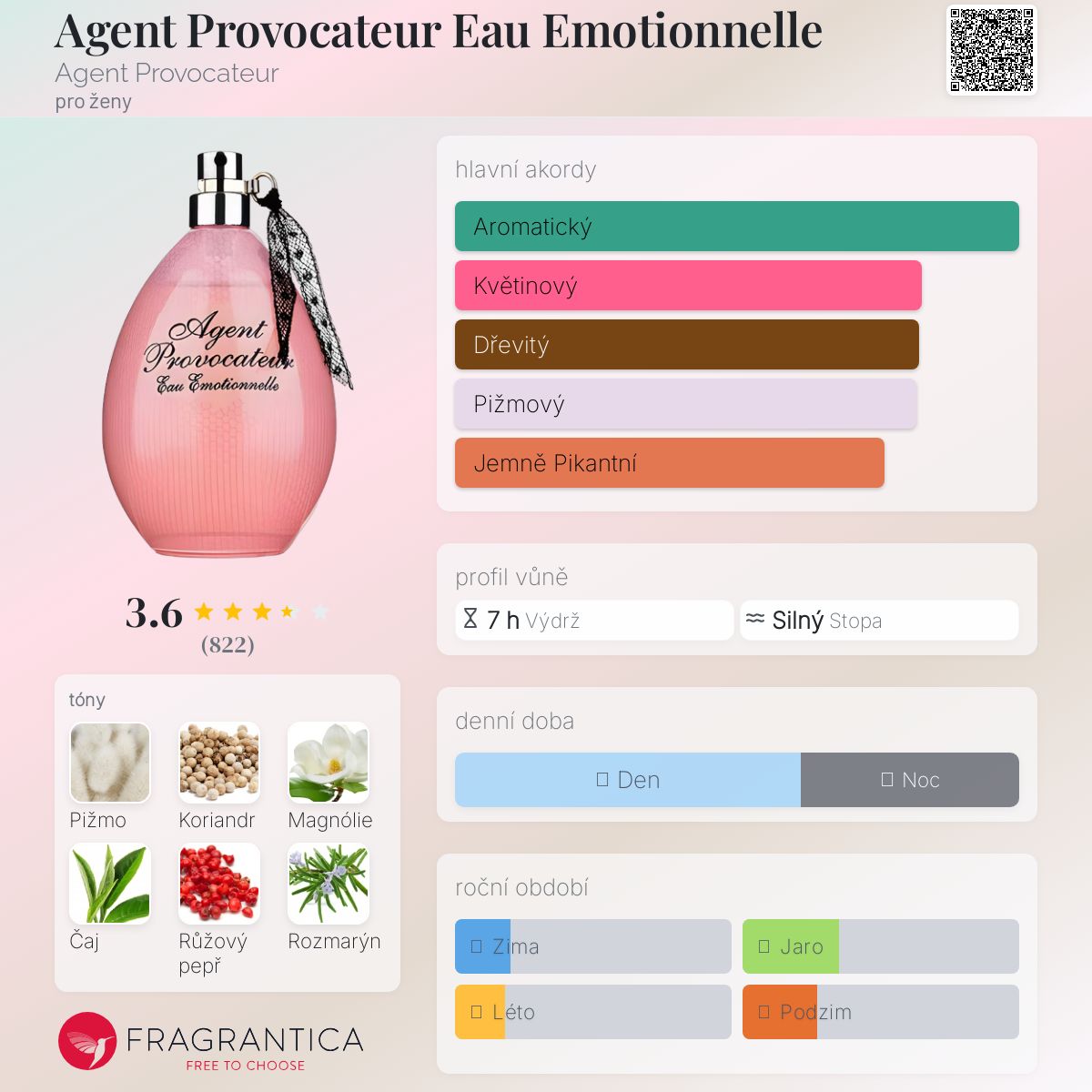 Agent Provocateur Eau Emotionnelle podle Agent Provocateur je Floral Woody Musk vůně pro ženy. Agent Provocateur Eau Emotionnelle byl/a uveden/a v roce 2006. Vrchní tóny jsou Koriandr, Růžový pepř a Rozmarýn; střední tóny jsouMagnólie, Bílý čaj, Japonská vonokvětka, Ylang-Ylang, Gardénie a Jasmín ; základní tóny jsou Pižmo, Tahitský vetiver, Cedr a Jantar (ambra).