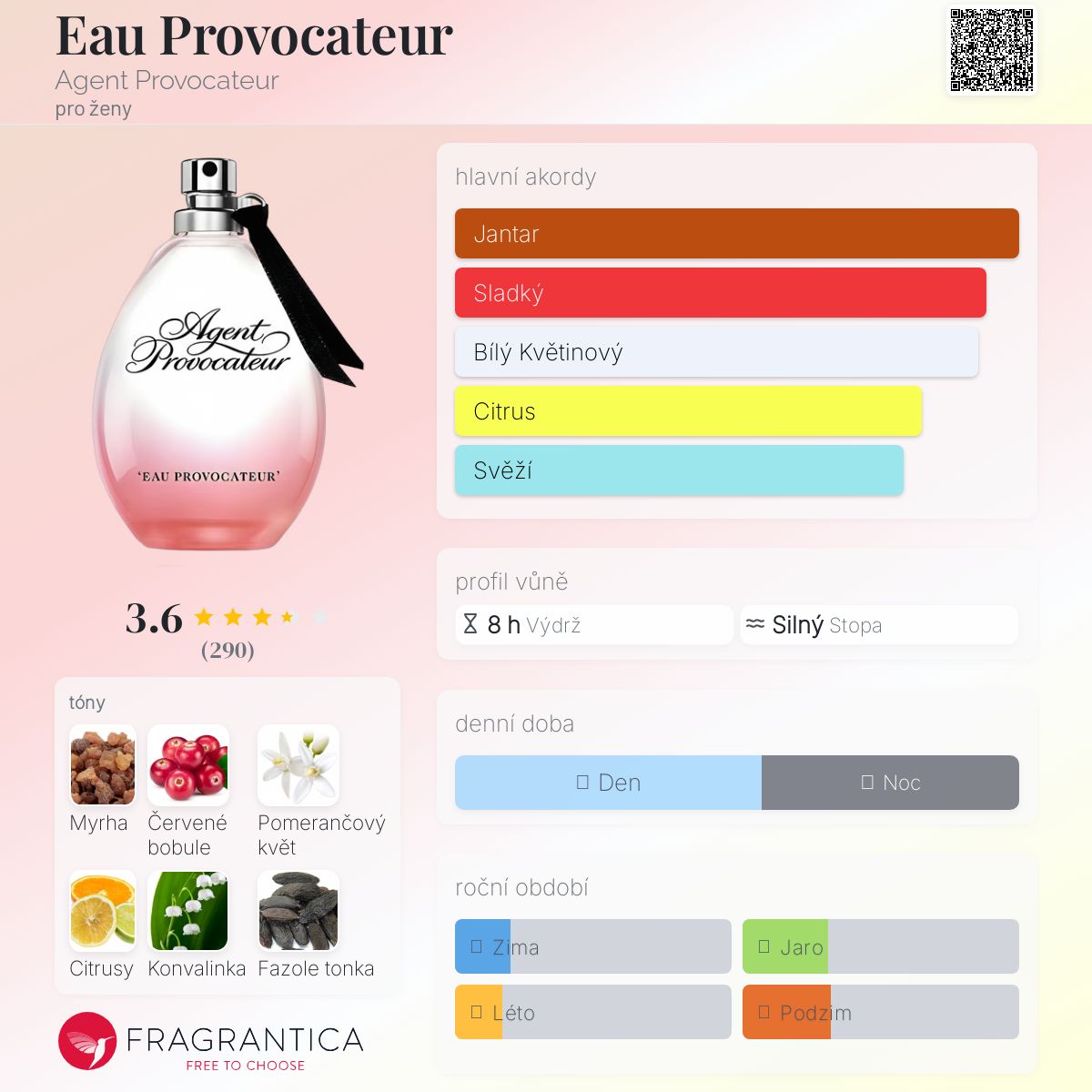 Eau Provocateur podle Agent Provocateur je Floral vůně pro ženy. Eau Provocateur byl/a uveden/a v roce 2012. Vrchní tóny jsou Červené bobule a Citrusy; střední tóny jsouKvět afrického pomeranče a Konvalinka ; základní tóny jsou Myrha, Fazole tonka a Vanilka.