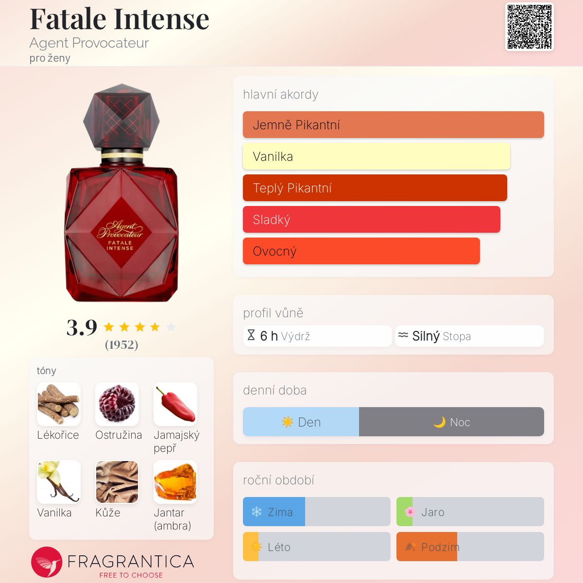 Fatale Intense podle Agent Provocateur je Orientální Floral vůně pro ženy. Fatale Intense byl/a uveden/a v roce 2015. Vrchní tóny jsou Lékořice, Ostružina a Chilli papričky; střední tóny jsouMagnólie champaca, Červená růže a Lotus ; základní tóny jsou Vanilka, Kůže a Jantar (ambra).