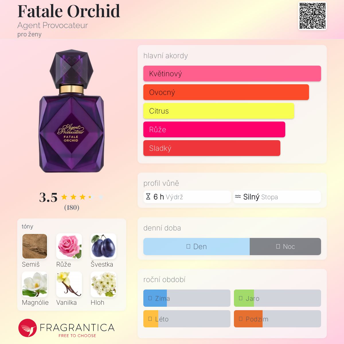 Fatale Orchid podle Agent Provocateur je Orientální Floral vůně pro ženy. Fatale Orchid byl/a uveden/a v roce 2018. Vrchní tóny jsou Meruňka, Citrón a Bergamot; střední tóny jsouRůže, Švestka, Magnólie a Hloh ; základní tóny jsou Semiš, Vanilka, Pačuli a Jantar (ambra).