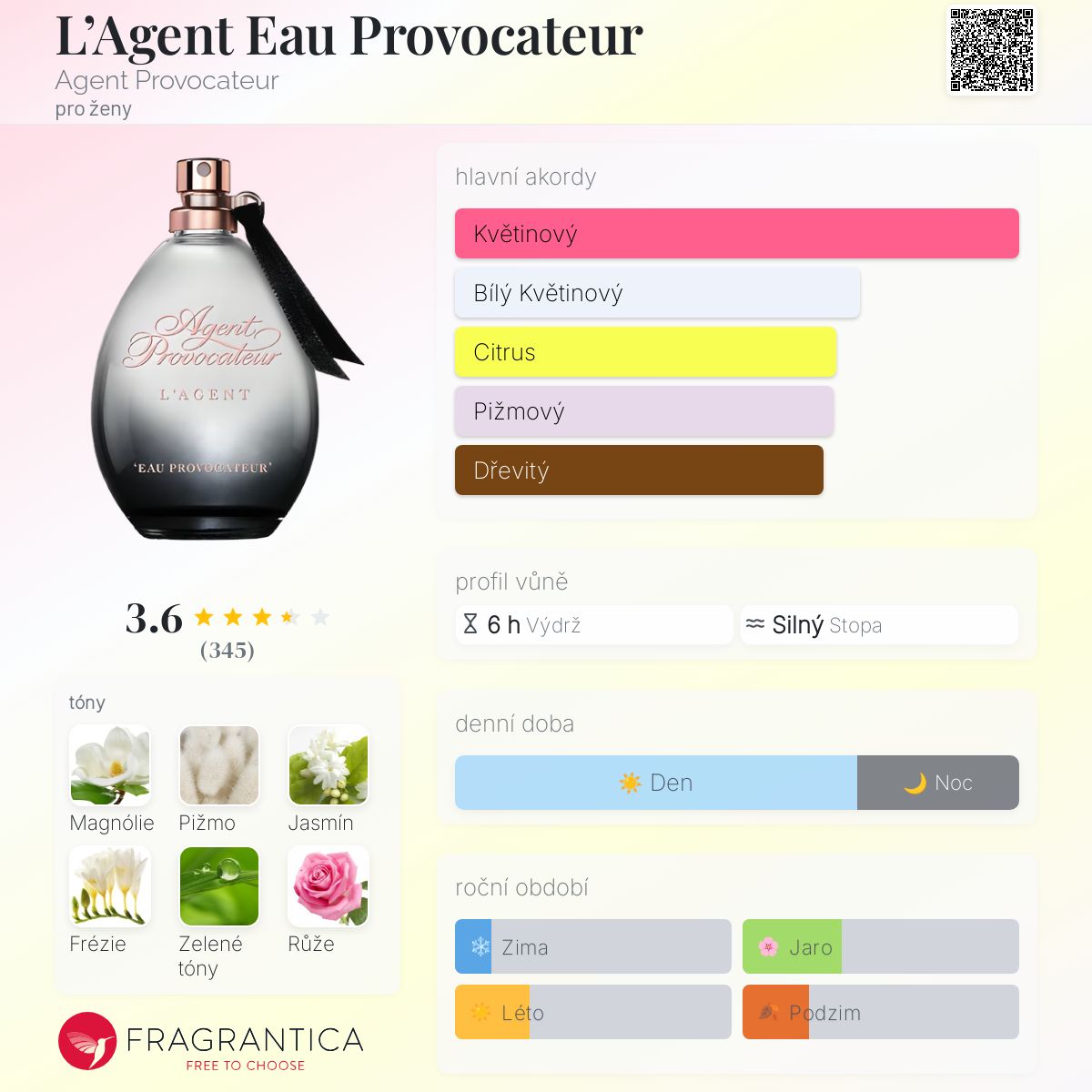 L’Agent Eau Provocateur podle Agent Provocateur je Orientální Floral vůně pro ženy. L’Agent Eau Provocateur byl/a uveden/a v roce 2012. Vrchní tóny jsou Zelené tóny, Bergamot, Meloun, Červené jablko, Broskev a Mandarinka; střední tóny jsouMagnólie, Jasmín, Frézie, Růže, Ylang-Ylang a Tuberóza ; základní tóny jsou Pižmo, Pačuli, Santalové dřevo a Jantar (ambra).
