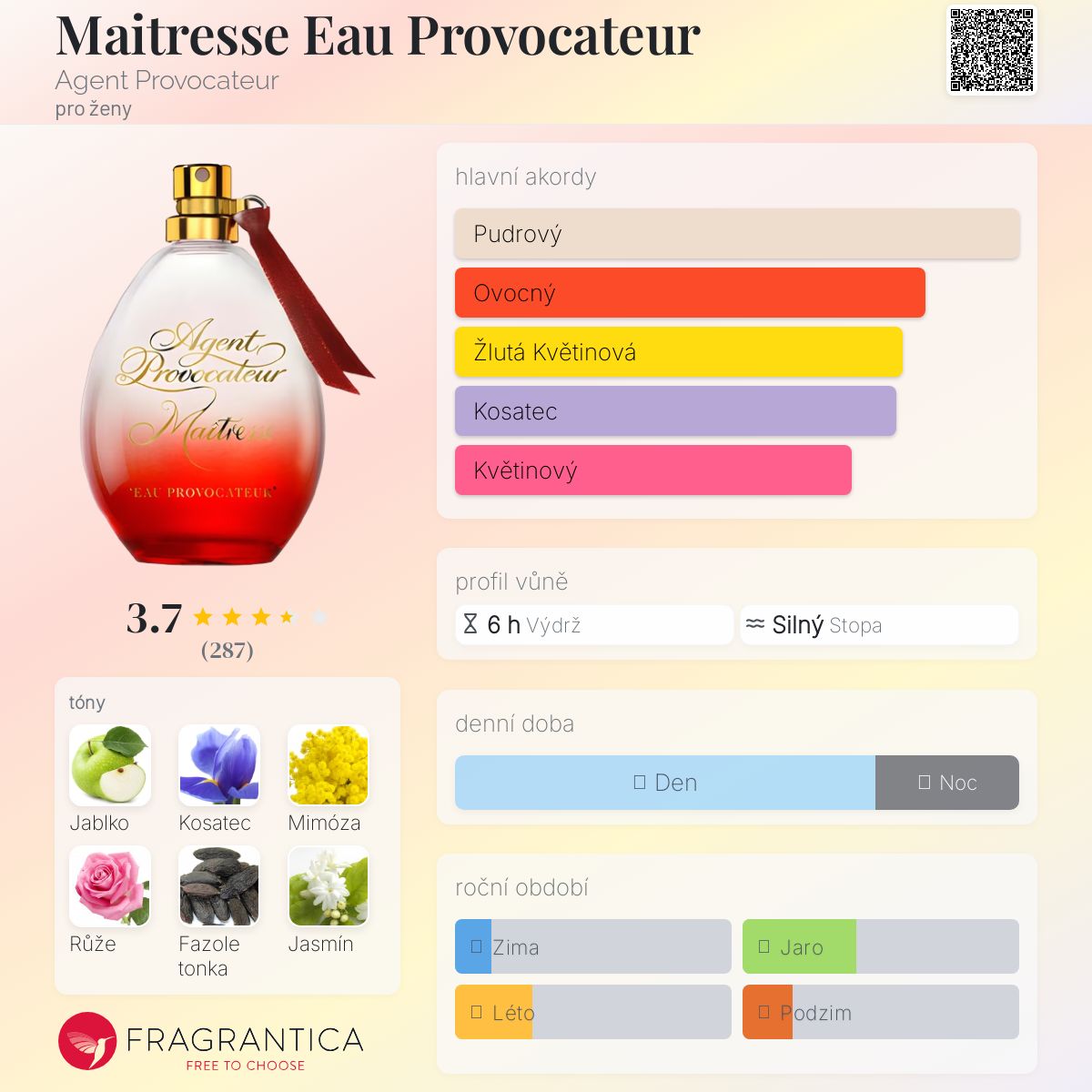 Maitresse Eau Provocateur podle Agent Provocateur je Floral vůně pro ženy. Maitresse Eau Provocateur byl/a uveden/a v roce 2012. "Nosem" za touto vůní je Christian Provenzano. Vrchní tóny jsou Granny Smith jablko, Acai berry, Ylang-Ylang, Grapefruit, Bergamot a Černý rybíz; střední tóny jsouKosatec, Mimóza, Růže a Jasmín Sambac ; základní tóny jsou Fazole tonka, Santalové dřevo, Jantar (ambra), Pižmo, Vanilka a Cedr.