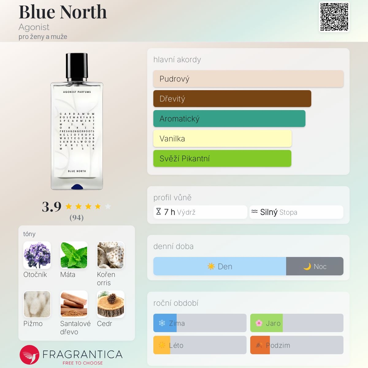 Blue North podle Agonist je Aromatic vůně pro ženy a muže. Blue North byl/a uveden/a v roce 2015. Vrchní tóny jsou Pikantní máta, Kardamom a Rozmarýn; střední tóny jsouOtočník, Máta, Orris a Zázvor ; základní tóny jsou Pižmo, Santalové dřevo, Extrakt z bílého cedru a Vanilka.