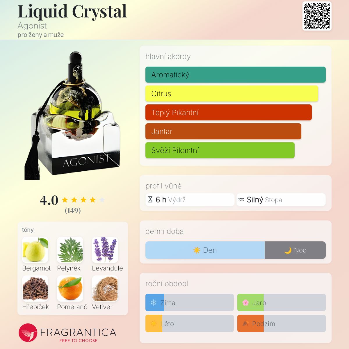 Liquid Crystal podle Agonist je Aromatic Spicy vůně pro ženy a muže. Liquid Crystal byl/a uveden/a v roce 2010. "Nosem" za touto vůní je Fabrice Pellegrin. Vrchní tóny jsou Bergamot, Pelyněk, Hřebíček, Sicilský pomeranč a Kořeněné tóny; střední tóny jsouLevandule, Kadidlo a Pačuli ; základní tóny jsou Vetiver, Fazole tonka, Labdanum, Bílý jantar (ambra) a Cedr.