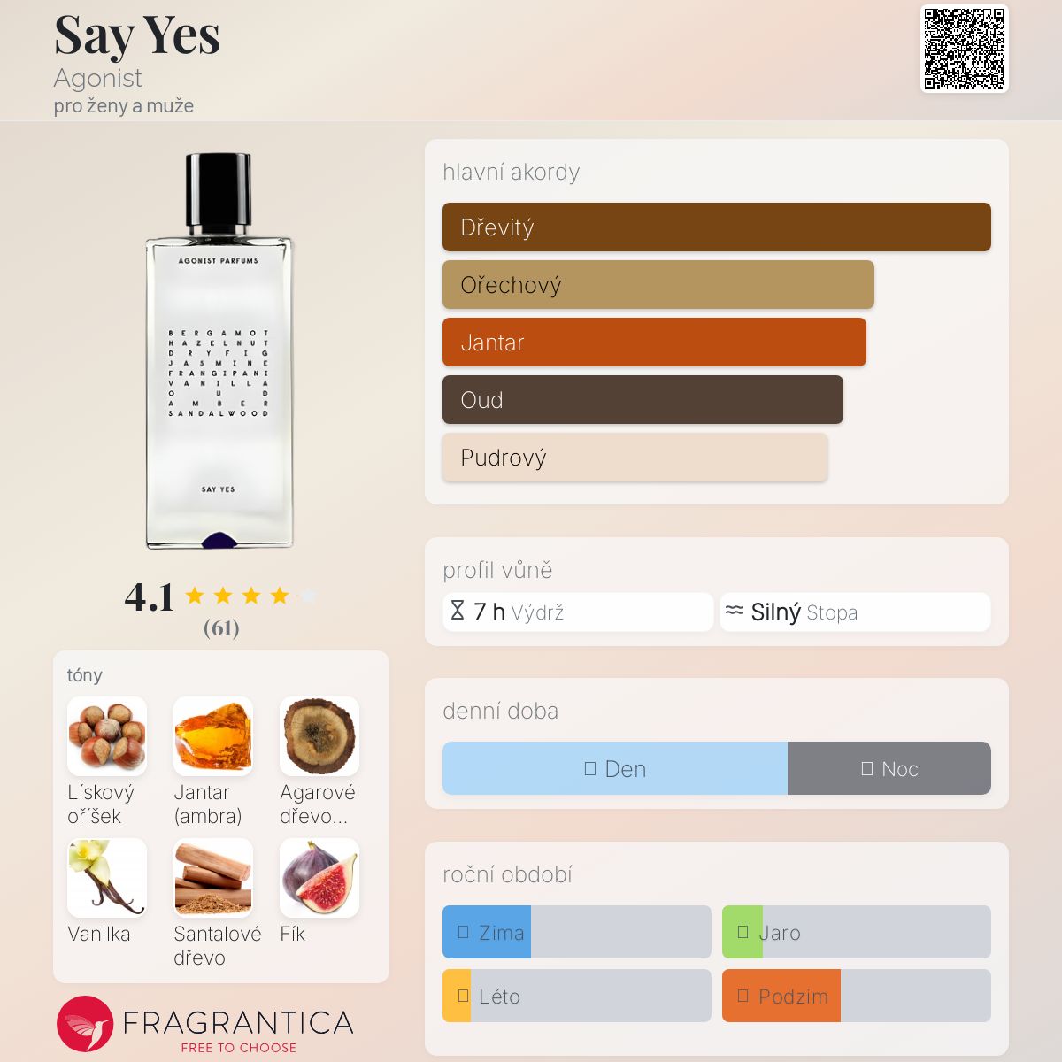 Say Yes podle Agonist je Woody Aromatic vůně pro ženy a muže. Say Yes byl/a uveden/a v roce 2018. Vrchní tóny jsou Lískový oříšek, Fík a Bergamot; střední tóny jsouVanilka, Plumérie a Jasmín ; základní tóny jsou Jantar (ambra), Agarové dřevo (oud) a Santalové dřevo.