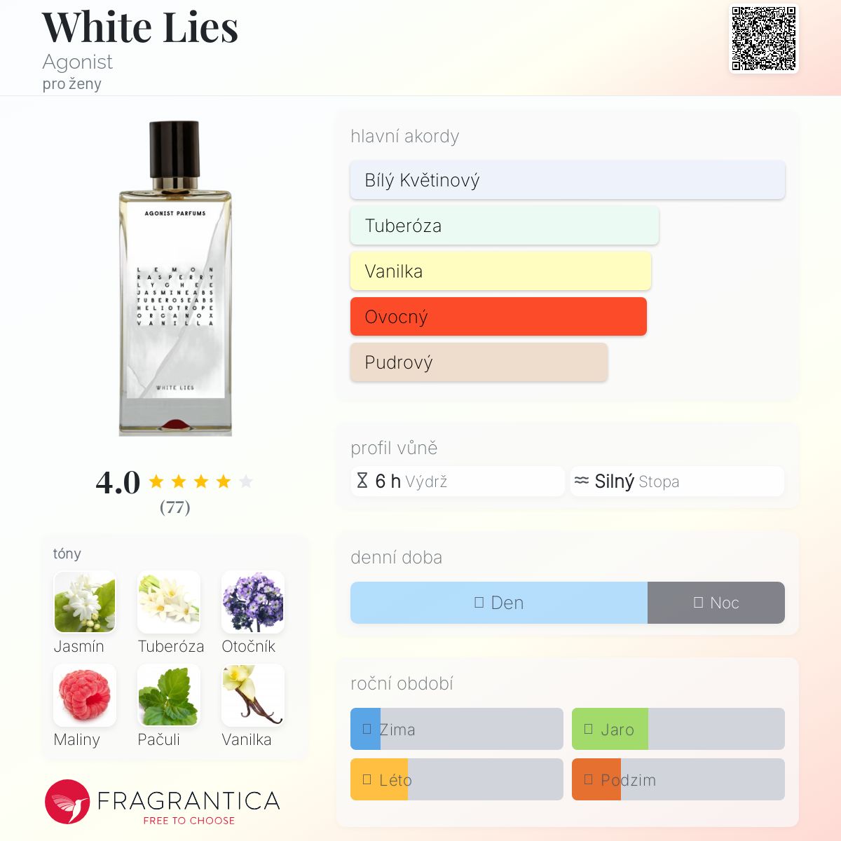 White Lies podle Agonist je Floral vůně pro ženy. White Lies byl/a uveden/a v roce 2016. Vrchní tóny jsou Maliny, Liči a Citrón; střední tóny jsouJasmín, Tuberóza a Otočník ; základní tóny jsou Pačuli a Vanilka.