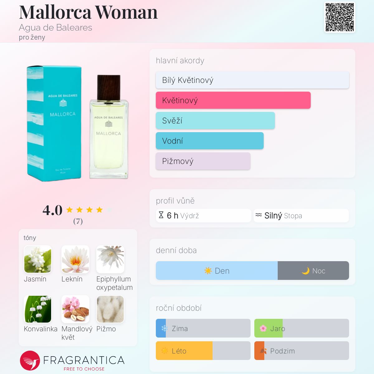 Mallorca Woman podle Agua de Baleares je Floral Aquatic vůně pro ženy. Vrchní tón je Leknín ; střední tóny jsouJasmín, Epiphyllum oxypetalum, Konvalinka a Mandlový květ ; základní tón je Pižmo.