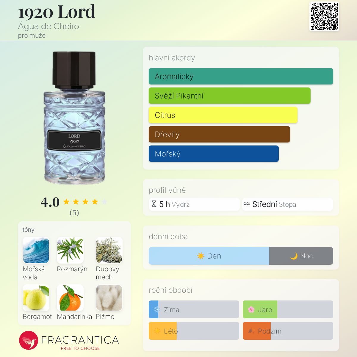 1920 Lord podle Água de Cheiro je Aromatic Fougere vůně pro muže. 1920 Lord byl/a uveden/a v roce 2021. Vrchní tóny jsou Mořské tóny, Bergamot, Mandarinka a Levandule; střední tóny jsouRozmarýn, Muškátový oříšek a Cedr ; základní tóny jsou Dubový mech, Pižmo, Kašmírové dřevo a Pačuli.