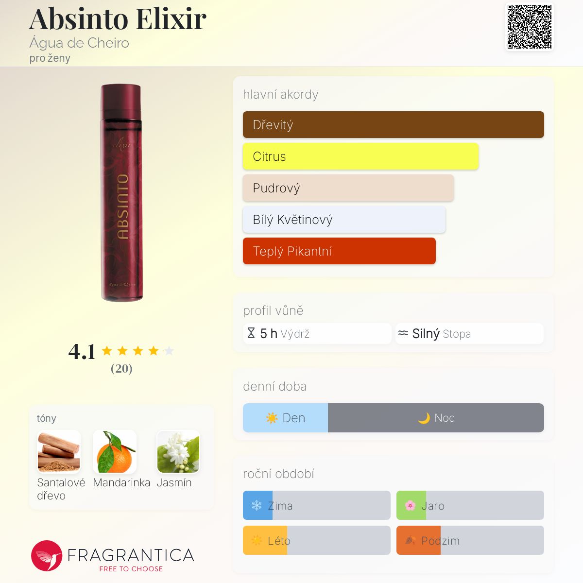 Absinto Elixir podle Água de Cheiro je Floral Fruity vůně pro ženy. Vrchní tón je Mandarinka ; střední tón jeJasmín ; základní tón je Santalové dřevo.