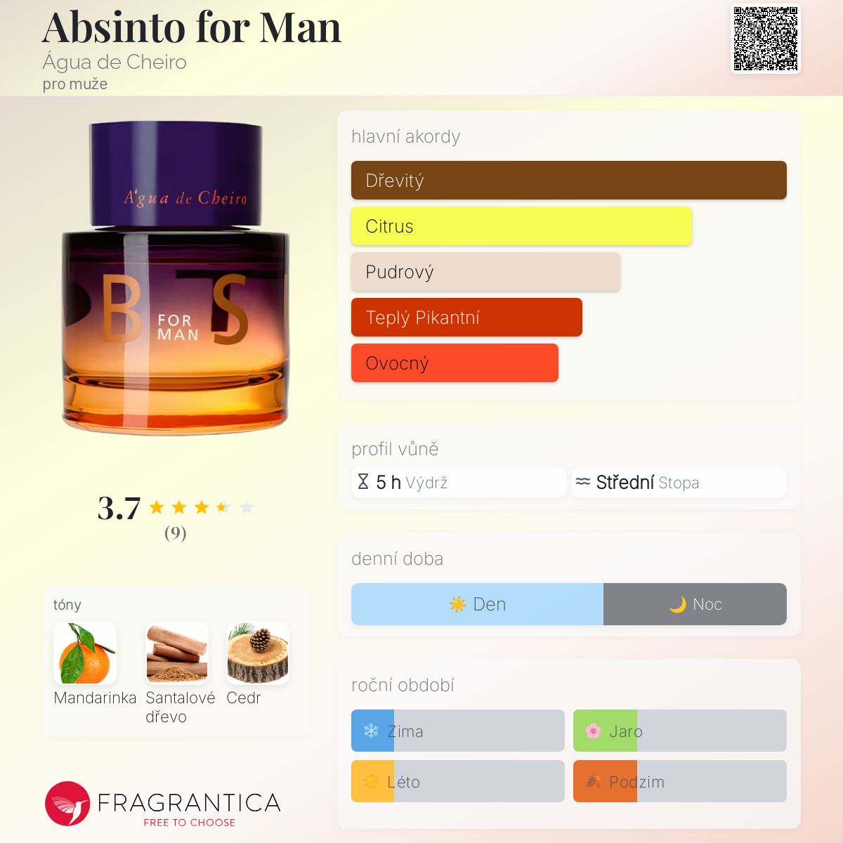 Absinto for Man podle Água de Cheiro je Citrus Aromatic vůně pro muže. Vrchní tón je Mandarinka ; střední tón jeSantalové dřevo ; základní tón je Cedr.