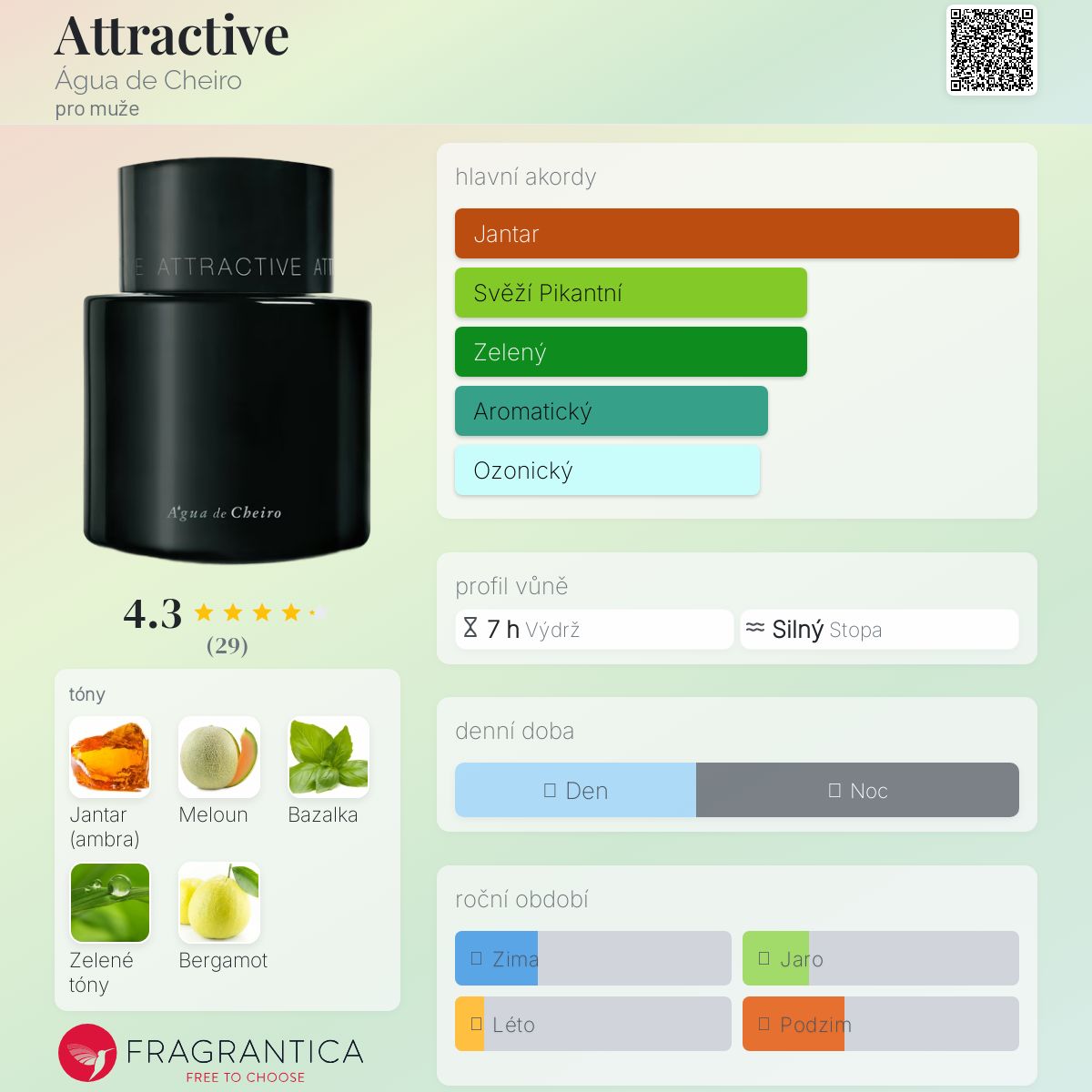 Attractive podle Água de Cheiro je Aromatic Spicy vůně pro muže. Vrchní tóny jsou Meloun, Bazalka a Bergamot; střední tón jeZelené tóny ; základní tón je Jantar (ambra).