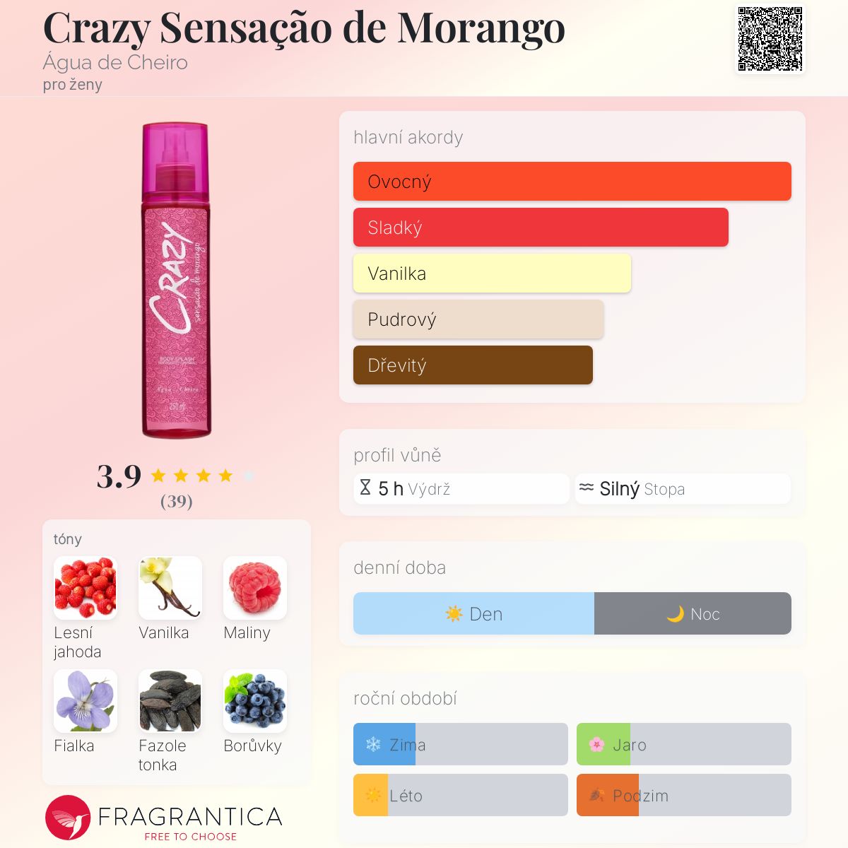 Crazy Sensação de Morango podle Água de Cheiro je Floral Fruity Gourmand vůně pro ženy. Crazy Sensação de Morango byl/a uveden/a v roce 2018. Vrchní tóny jsou Lesní jahoda, Maliny, Borůvky a Ostružina; střední tóny jsouFialka, Pivoňka a Konvalinka ; základní tóny jsou Vanilka, Fazole tonka a Pižmo.