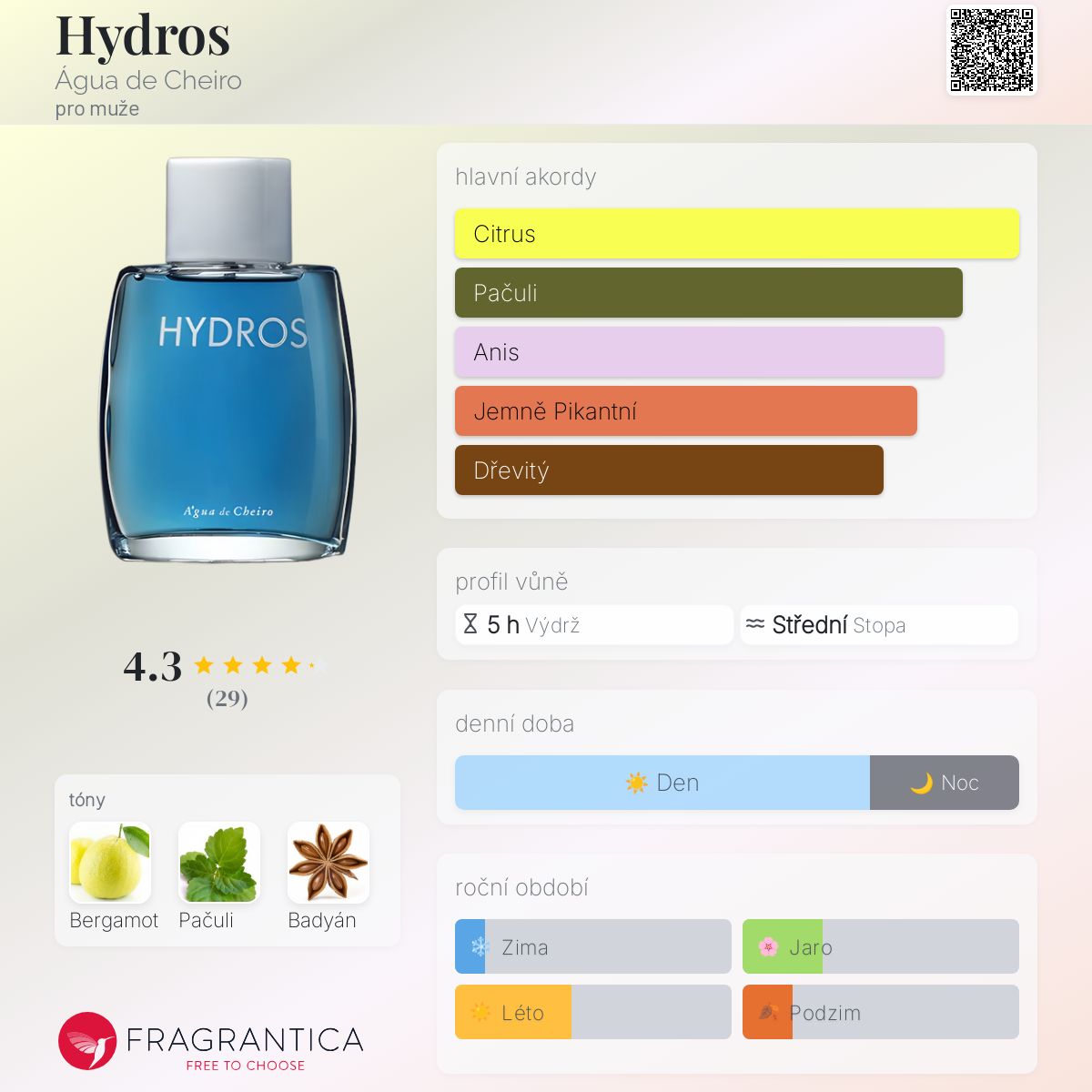Hydros podle Água de Cheiro je Aromatic Green vůně pro muže. Vrchní tón je Bergamot ; střední tón jeBadyán ; základní tón je Pačuli.