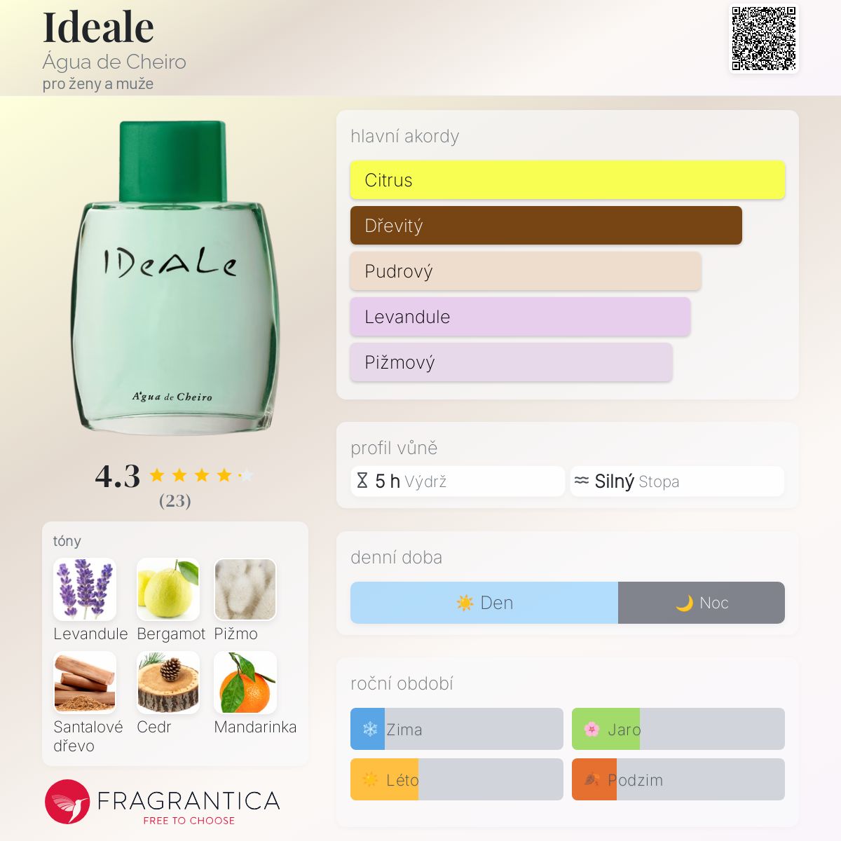 Ideale podle Água de Cheiro je Chypre vůně pro ženy a muže. Vrchní tóny jsou Levandule, Bergamot a Mandarinka; střední tóny jsouBroskev a Magnólie ; základní tóny jsou Pižmo, Santalové dřevo, Cedr a Fazole tonka.