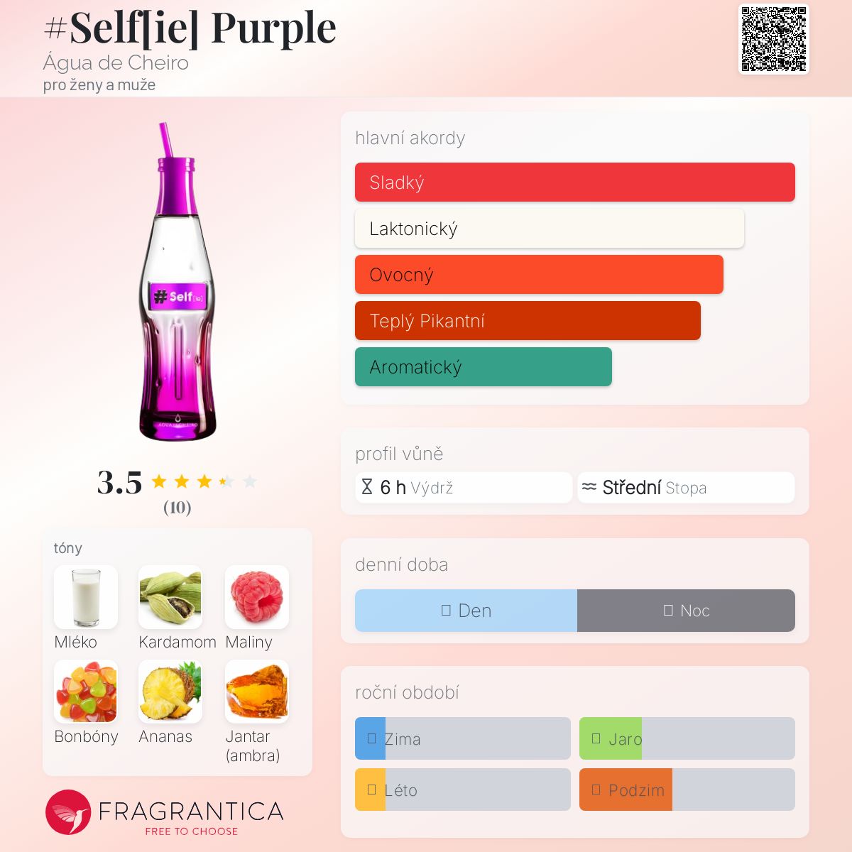 #Self[ie] Purple podle Água de Cheiro je Floral Fruity Gourmand vůně pro ženy a muže. #Self[ie] Purple byl/a uveden/a v roce 2019. Vrchní tóny jsou Maliny a Ananas; střední tóny jsouKardamom, Sladké tóny a Jasmín ; základní tóny jsou Mléko, Jantar (ambra) a Santalové dřevo.