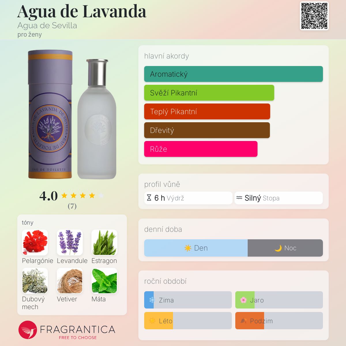 Agua de Lavanda podle Agua de Sevilla je Aromatic vůně pro ženy. Agua de Lavanda byl/a uveden/a v roce 2000. Vrchní tóny jsou Levandule, Estragon a Máta; střední tóny jsouBourbonské geránium , Levandule, Růže, Santalové dřevo, Jasmín a Kadidlo ; základní tóny jsou Mech, Vetiver, Santalové dřevo, Benzoin, Kadidlo, Pižmo a Skořice.