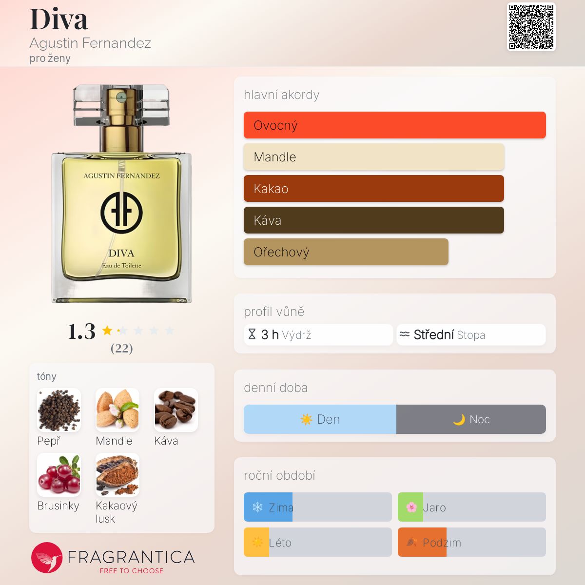 Diva podle Agustin Fernandez je Aromatic Spicy vůně pro ženy. Diva byl/a uveden/a v roce 2022. Vrchní tóny jsou Mandle a Káva; střední tón jeBrusinky ; základní tóny jsou Pepř a Kakao.