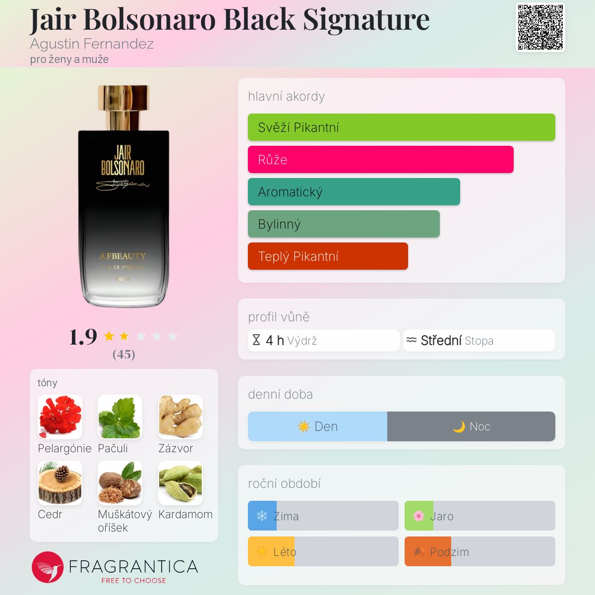 Jair Bolsonaro Black Signature podle Agustin Fernandez je Citrus Aromatic vůně pro ženy a muže. Toto je nová vůně. Jair Bolsonaro Black Signature byl/a uveden/a v roce 2024. Vrchní tóny jsou Zázvor, Bergamot a Jalovec; střední tóny jsouPelargónie, Muškátový oříšek, Kardamom, Levandule a Šalvěj ; základní tóny jsou Pačuli, Cedr a Fazole tonka.