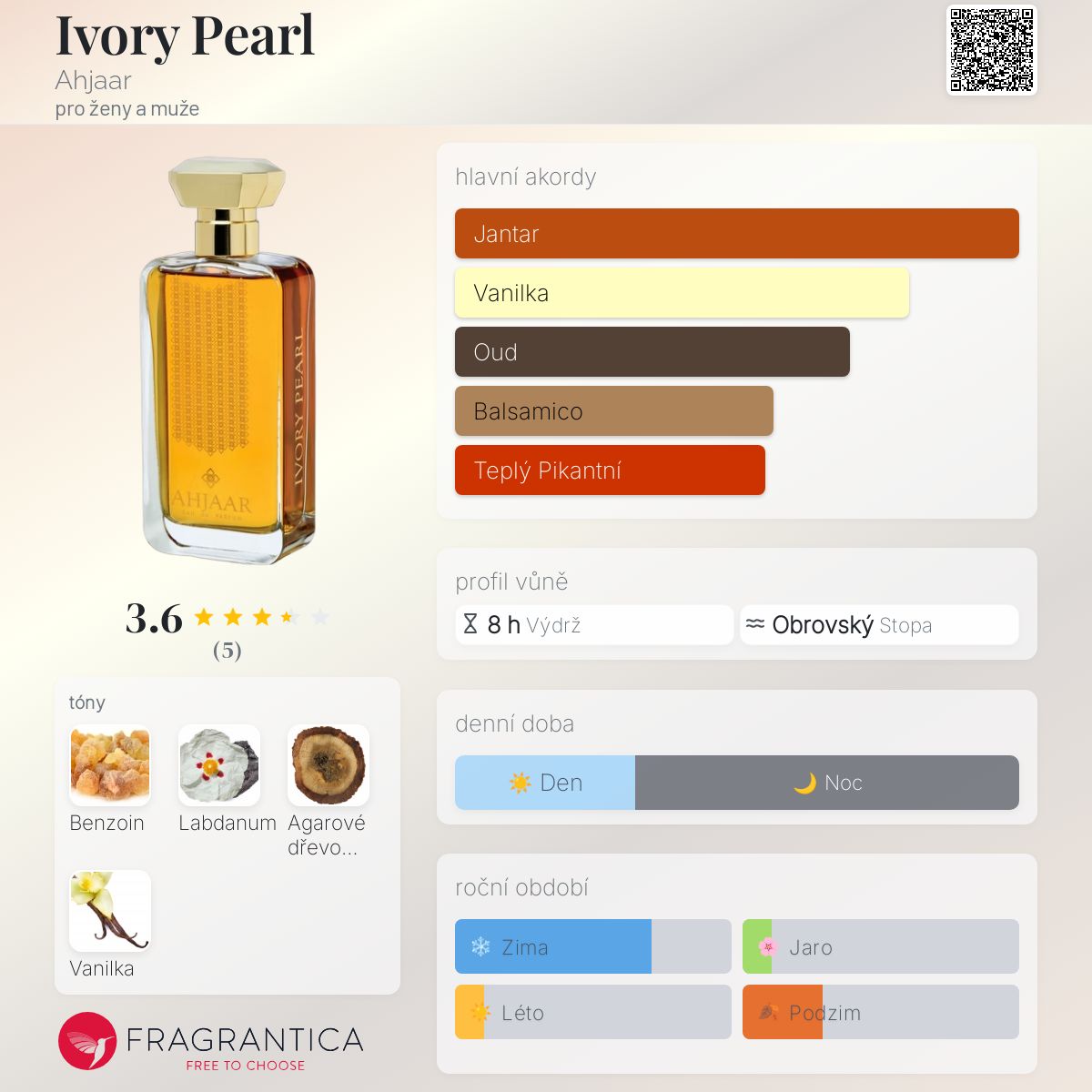 Ivory Pearl podle Ahjaar je Orientální Spicy vůně pro ženy a muže. Ivory Pearl byl/a uveden/a v roce 2014. Vrchní tón je Benzoin ; střední tón jeLabdanum ; základní tóny jsou Agarové dřevo (oud) a Vanilka.