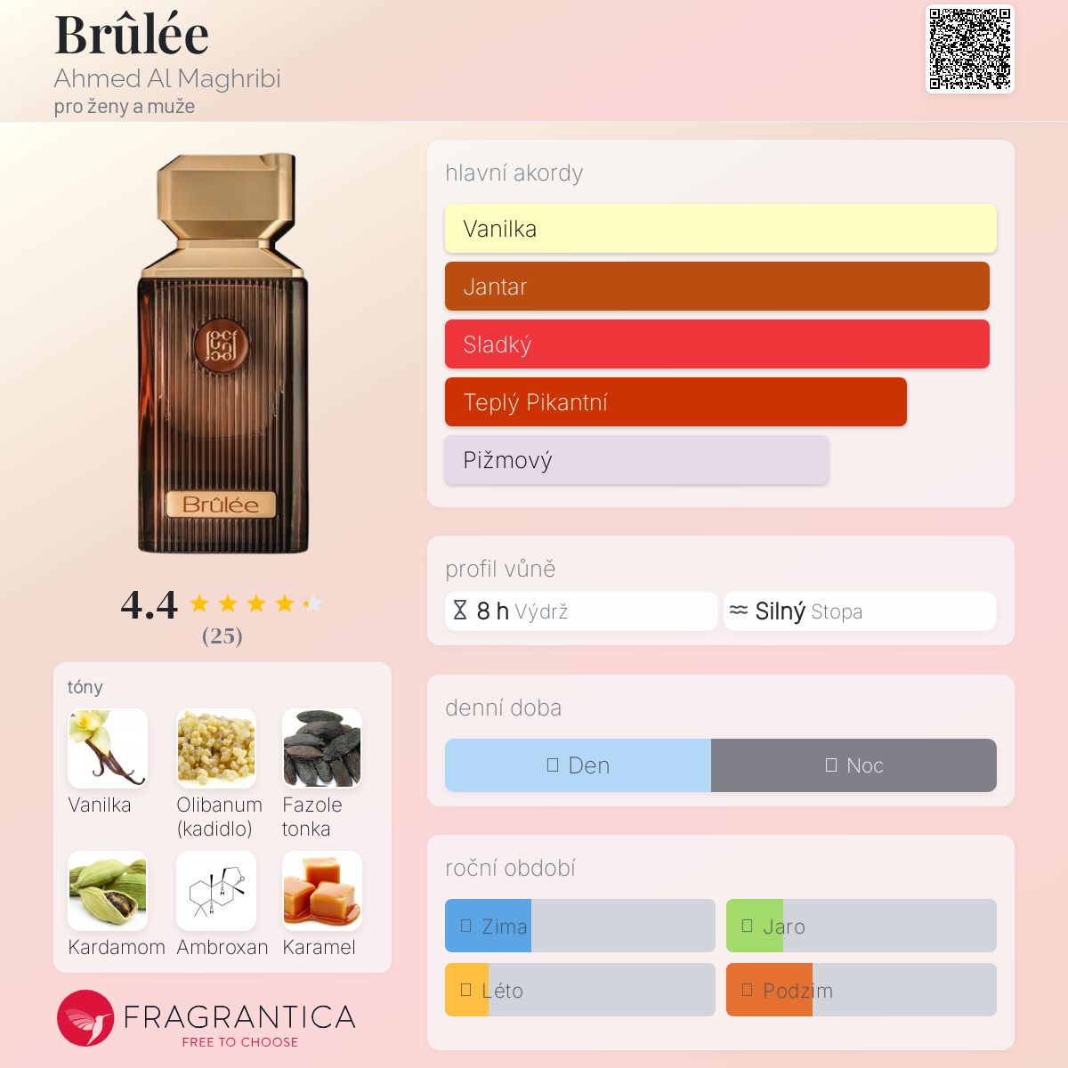 Brûlée podle Ahmed Al Maghribi je Orientální Vanilla vůně pro ženy a muže. Toto je nová vůně. Brûlée byl/a uveden/a v roce 2025. Vrchní tóny jsou Kardamom, Karamel, Cukr, Kokos a Sicilský bergamot; střední tóny jsouVanilka, Kadidlo, Pomerančový květ, Čokoláda a Mléko ; základní tóny jsou Fazole tonka, Ambroxan a Bílé pižmo.
