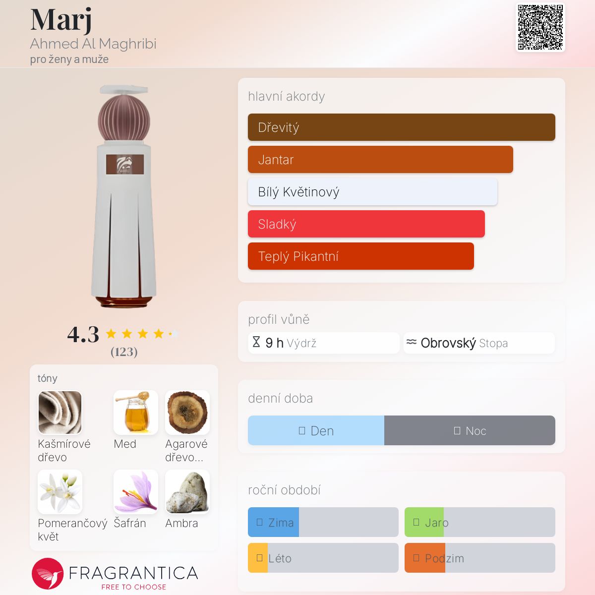 Marj podle Ahmed Al Maghribi je vůně pro ženy a muže. Marj byl/a uveden/a v roce 2023. Vrchní tóny jsou Agarové dřevo (oud), Med, Růžový pepř, Muškátový oříšek, Elimi, Bergamot a Mandarinka; střední tóny jsouKašmírové dřevo, Pomerančový květ, Šafrán, Jasmín, Pačuli, Skořice a Vetiver ; základní tóny jsou Agarové dřevo (oud), Šafrán, Ambra, Kůže, Maliny, Dubový mech, Fialka, Jantar (ambra), Santalové dřevo, Pižmo a Hruška.