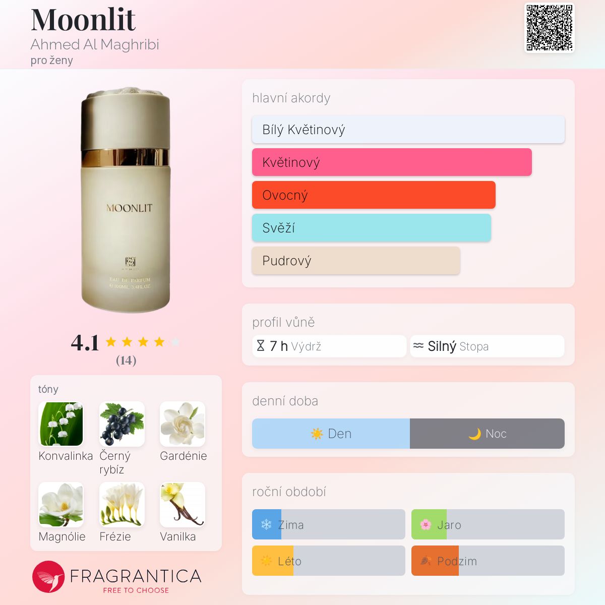 Moonlit podle Ahmed Al Maghribi je Floral Fruity vůně pro ženy. Moonlit byla spuštěna během 2020. Vrchní tóny jsou Černý rybíz, Nektarinka, Citrusy a Jablko; střední tóny jsouKonvalinka, Gardénie, Magnólie, Frézie a Jasmín ; základní tóny jsou Vanilka, Pižmo, Santalové dřevo, Pačuli a Jantar (ambra).
