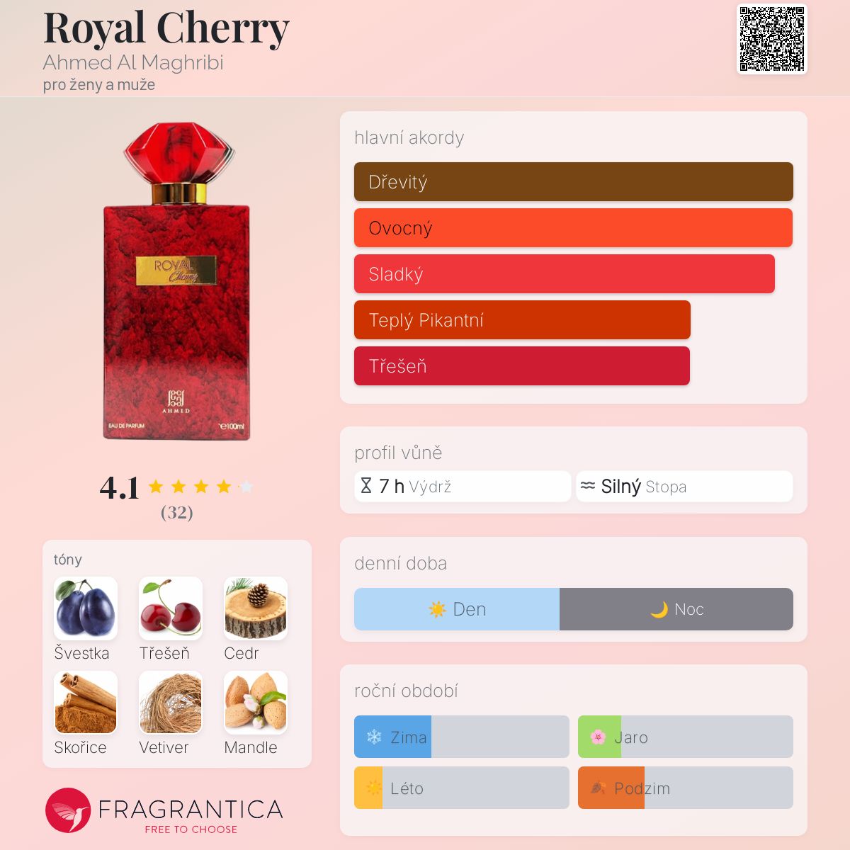 Royal Cherry podle Ahmed Al Maghribi je Orientální Vanilla vůně pro ženy a muže. Royal Cherry byla spuštěna během 2020. Vrchní tóny jsou Švestka, Třešeň a Hořká mandle; střední tóny jsouJasmín a Turecká růže ; základní tóny jsou Cedr, Skořice, Vetiver, Santalové dřevo, Fazole tonka, Benzoin a Vanilka.