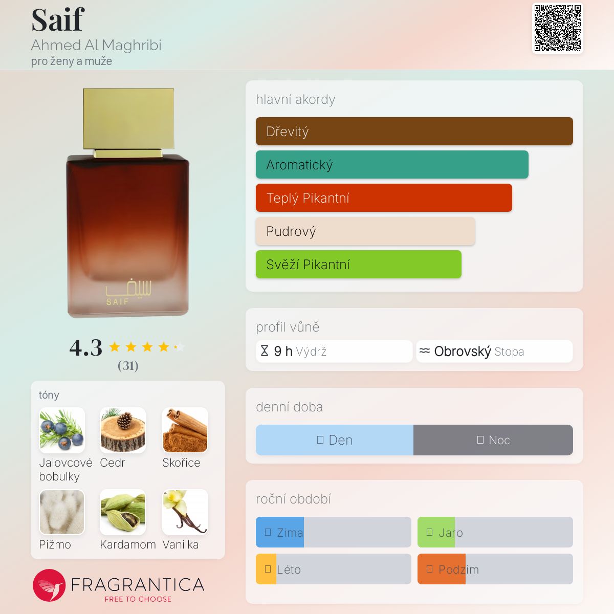 Saif podle Ahmed Al Maghribi je vůně pro ženy a muže. Saif byla spuštěna během 2020. Vrchní tóny jsou Jalovcové bobulky, Kardamom, Bergamot a Cypřiš; střední tóny jsouCedr a Skořice ; základní tóny jsou Pižmo, Vanilka a Santalové dřevo.