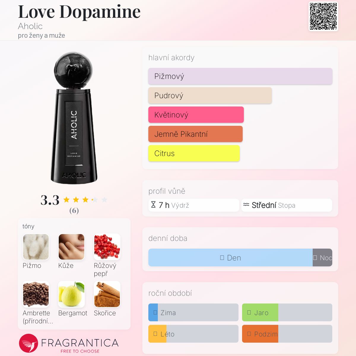 Love Dopamine podle Aholic je Floral Woody Musk vůně pro ženy a muže. Toto je nová vůně. Love Dopamine byl/a uveden/a v roce 2025. "Nosem" za touto vůní je Olivier Maurel. Vrchní tóny jsou Růžový pepř a Bergamot; střední tóny jsouAmbrette (přírodní pižmo), Skořice, Orris a Zázvor ; základní tóny jsou Pižmo, Kůže a Santalové dřevo.