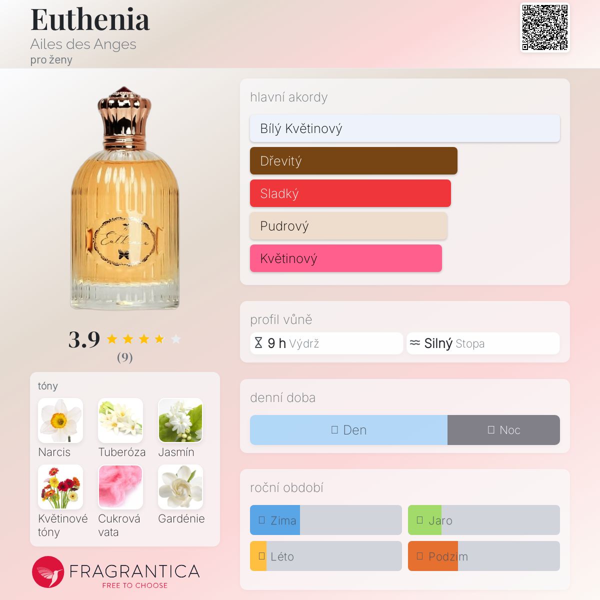 Euthenia podle Ailes des Anges je Orientální Floral vůně pro ženy. Euthenia byl/a uveden/a v roce 2023. Vrchní tóny jsou Tuberóza, Jasmín, Květinové tóny a Cukrová vata; střední tóny jsouNarcis, Gardénie, Květ tiare, Mléko, Meruňka, Kůže a Pačuli ; základní tóny jsou Vanilka, Kadidlo, Bílé pižmo, Santalové dřevo a Cedr.