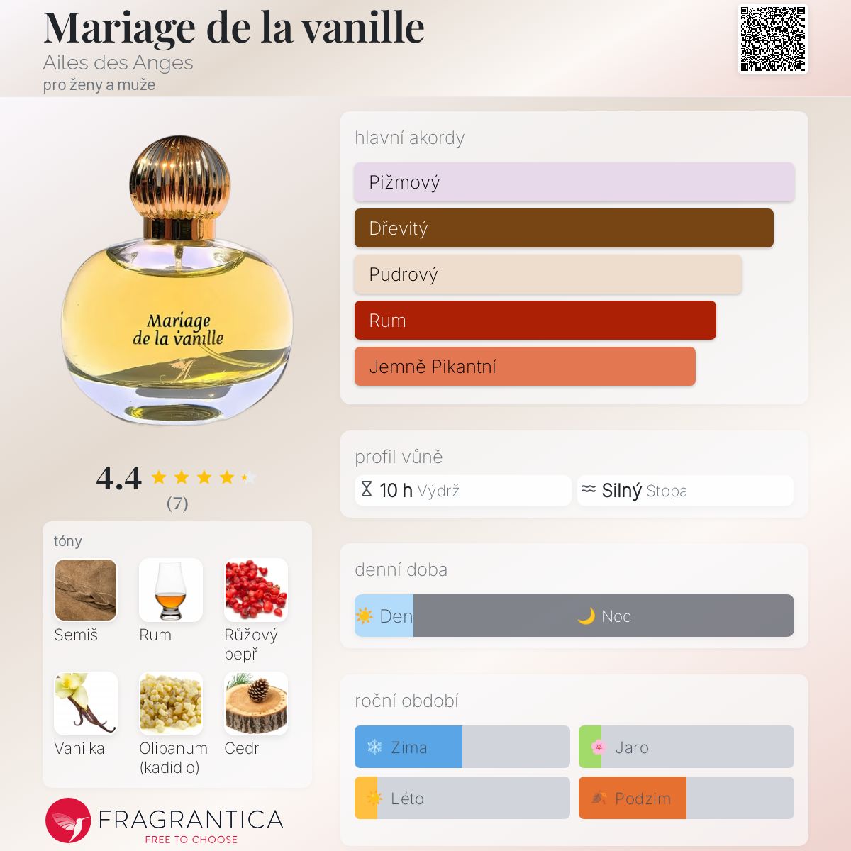 Mariage de la vanille podle Ailes des Anges je Orientální Vanilla vůně pro ženy a muže. Toto je nová vůně. Mariage de la vanille byl/a uveden/a v roce 2024. Vrchní tóny jsou Růžový pepř, Sezam a Bílá orchidej; střední tóny jsouSemiš, Rum, Bourbonská vanilka a Olibanum ; základní tóny jsou Vanilka, Cedr a Bílé pižmo.