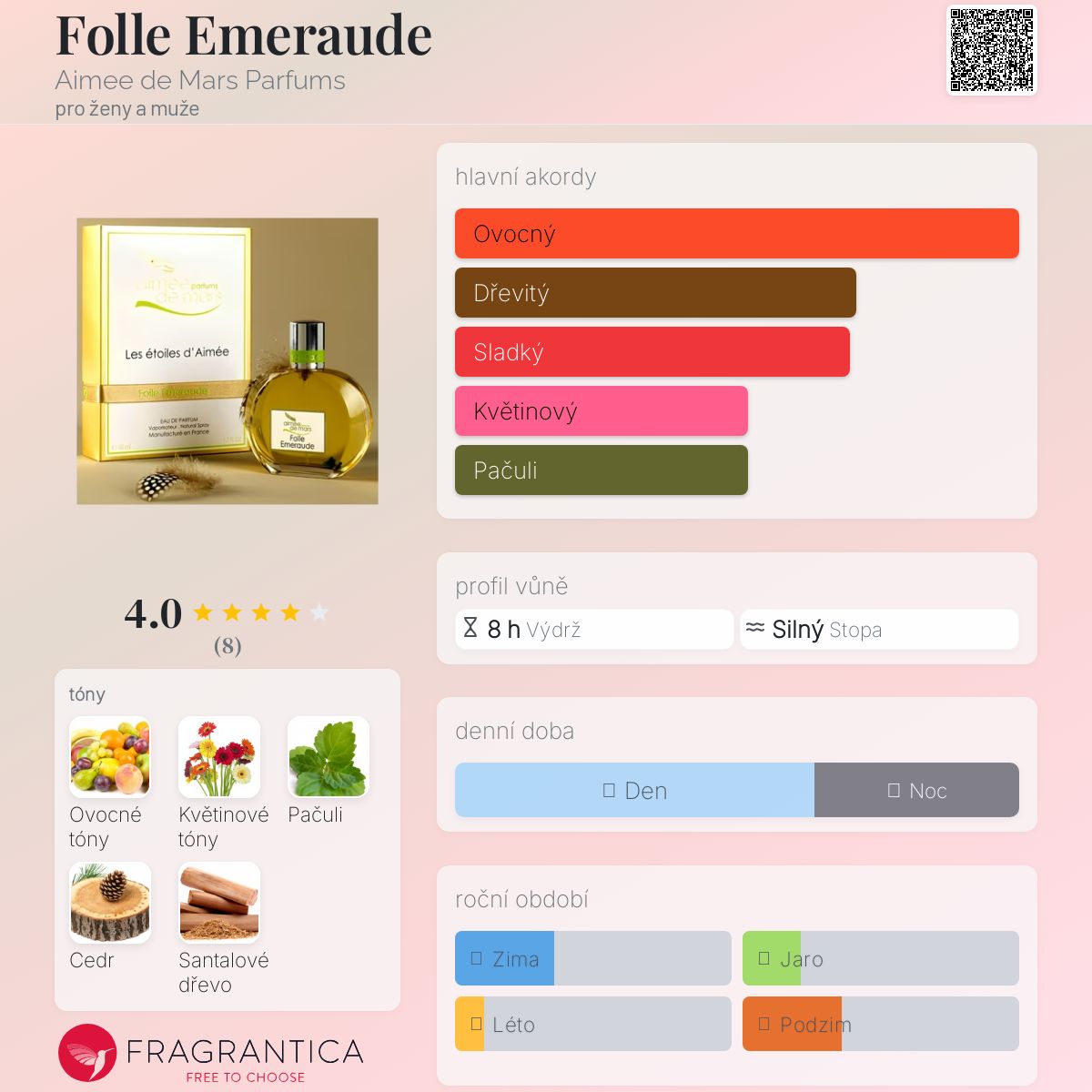 Folle Emeraude podle Aimee de Mars Parfums je Orientální Woody vůně pro ženy a muže. Folle Emeraude byl/a uveden/a v roce 2014. "Nosem" za touto vůní je Valerie Demars. Vrchní tón je Ovoce ; střední tón jeKvětinové tóny ; základní tóny jsou Pačuli, Cedr a Santalové dřevo.