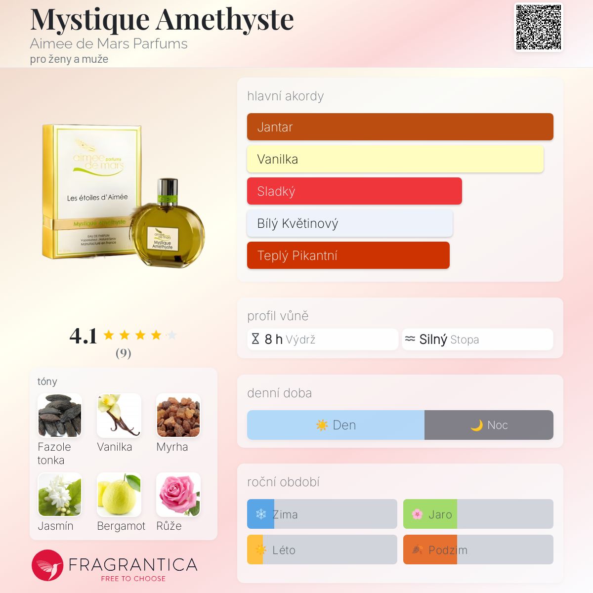 Mystique Amethyste podle Aimee de Mars Parfums je Floral Woody Musk vůně pro ženy a muže. Mystique Amethyste byl/a uveden/a v roce 2014. "Nosem" za touto vůní je Valerie Demars. Vrchní tón je Bergamot ; střední tóny jsouIndický jasmín a Bulharská růže ; základní tóny jsou Fazole tonka, Vanilka, Myrha, Olibanum a Pačuli.