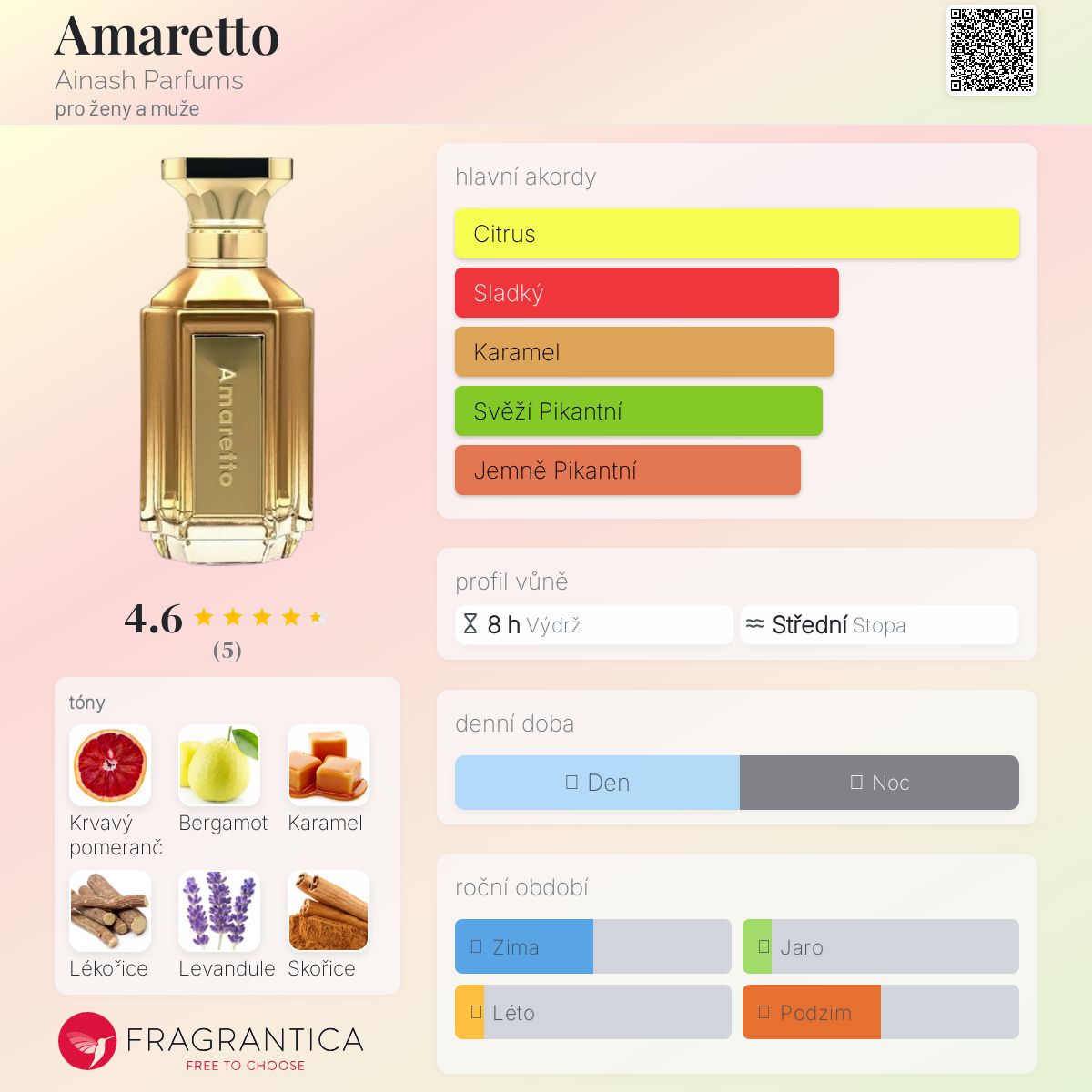 Amaretto podle Ainash Parfums je vůně pro ženy a muže. Amaretto byl/a uveden/a v roce 2023. Vrchní tóny jsou Krvavý pomeranč, Bergamot a Levandule; střední tóny jsouLékořice, Skořice a Jasmín ; základní tóny jsou Karamel, Vanilka a Pižmo.