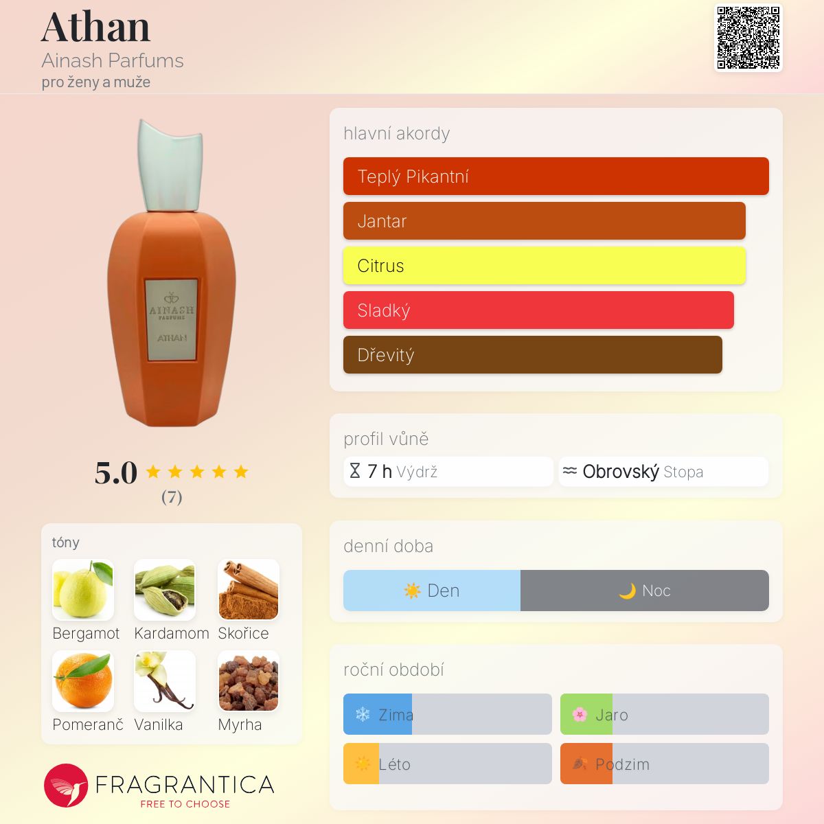 Athan podle Ainash Parfums je vůně pro ženy a muže. Athan byl/a uveden/a v roce 2024. Vrchní tóny jsou Bergamot, Kardamom, Skořice a Pomeranč; střední tóny jsouBourbonská vanilka a Myrha ; základní tóny jsou Cedr, Ambroxan, Vetiver, Pralinka a Pižmo.