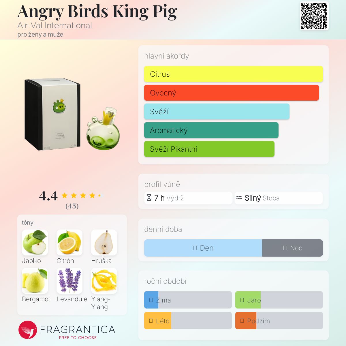 Angry Birds King Pig podle Air-Val International je Floral Green vůně pro ženy a muže. Angry Birds King Pig byl/a uveden/a v roce 2013. Vrchní tóny jsou Citrón, Hruška, Bergamot, Levandule, Bílý čaj a Zázvor; střední tóny jsouJablko, Ylang-Ylang, Šalvěj, Jasmín a Muškátový oříšek ; základní tóny jsou Pižmo, Jantar (ambra), Broskev a Vanilka.