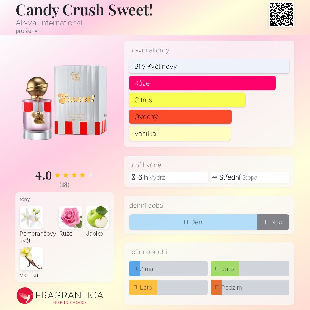 Candy Crush Sweet! podle Air-Val International je Floral Fruity vůně pro ženy. Candy Crush Sweet! byl/a uveden/a v roce 2014. Vrchní tóny jsou Pomerančový květ a Jablko; střední tón jeRůže ; základní tón je Vanilka.