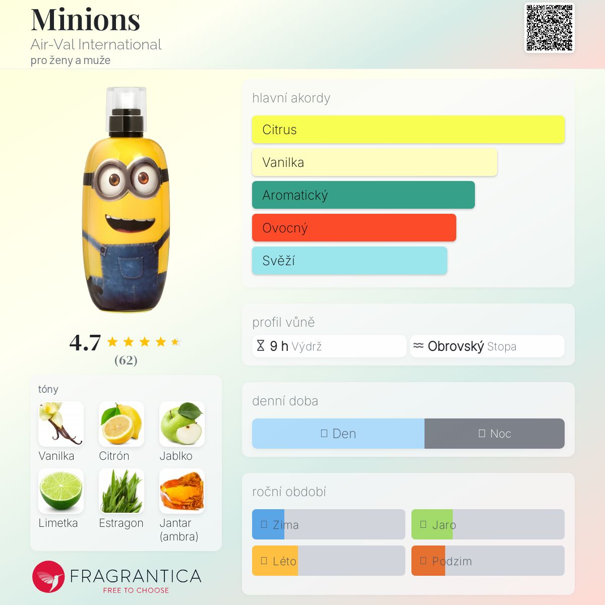 Minions podle Air-Val International je Citrus Aromatic vůně pro ženy a muže. Minions byl/a uveden/a v roce 2016. Vrchní tóny jsou Citrón, Limetka a Estragon; střední tón jeJablko ; základní tóny jsou Vanilka a Jantar (ambra).