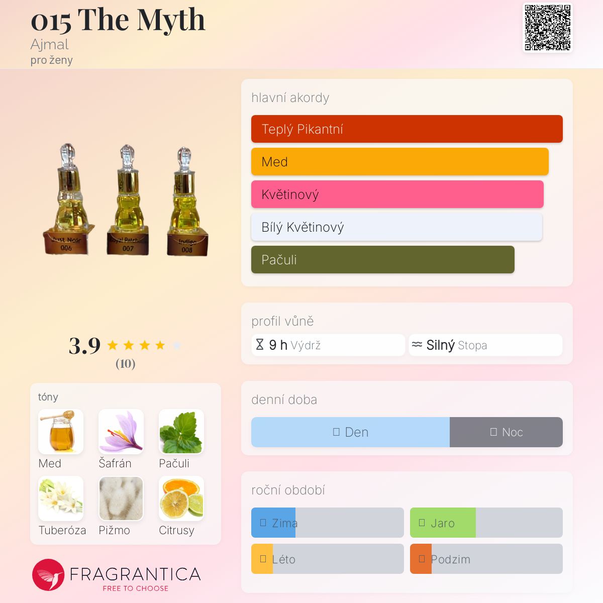 015 The Myth podle Ajmal je Floral Woody Musk vůně pro ženy. 015 The Myth byl/a uveden/a v roce 2014. Vrchní tóny jsou Citrusy a Květinové tóny; střední tóny jsouŠafrán, Tuberóza, Jasmín a Růže ; základní tóny jsou Med, Pačuli a Pižmo.